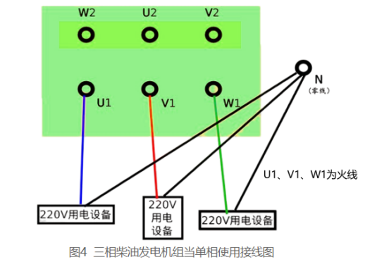 ●單相負載需均勻分配到各相,接線方法如圖4所示,避免三相不平衡(可能導致發電機過熱或電壓波動)。