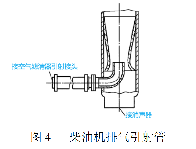 此外,需要注意的是當采用上述旋流紙質空氣濾清器時,消聲器出口處需預裝有與之匹配的排氣引射管(安裝在消聲器出口處,如圖4所示)。當柴油機排氣時,高速氣流通過喉管處使廢氣氣流增大,于是便形成了真空度。利用此真空度將空氣濾清器集塵室中的塵粒經(jīng)橡膠管吸入排氣引射管內,并與柴油機廢氣一起排出。